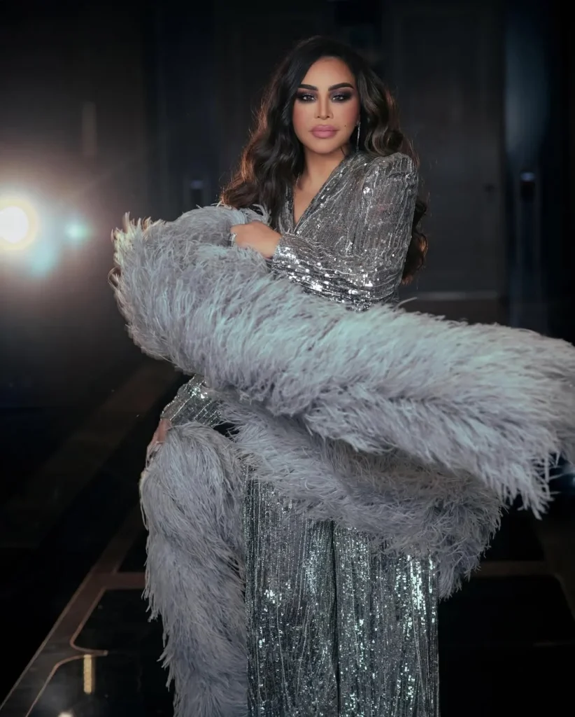 أكملت أحلام الإطلالة بشال طويل من الفرو الرمادي يضيء الإطلالة وينسجم مع اللون الفضي، ما يمنحها لمسة من الرقي والجمال. اختارت مجوهرات ماسية فخمة وناعمة لتعزيز التألق دون مبالغة. تركت الشعر منسدلًا على الكتفين بأسلوب مموّج بسيط وطبّقت مكياجاً قوياً يركّز على درجات ترابية وعيون مدخنة مع كحل أسود وخدود برونزية وشفاه بنية نيود.