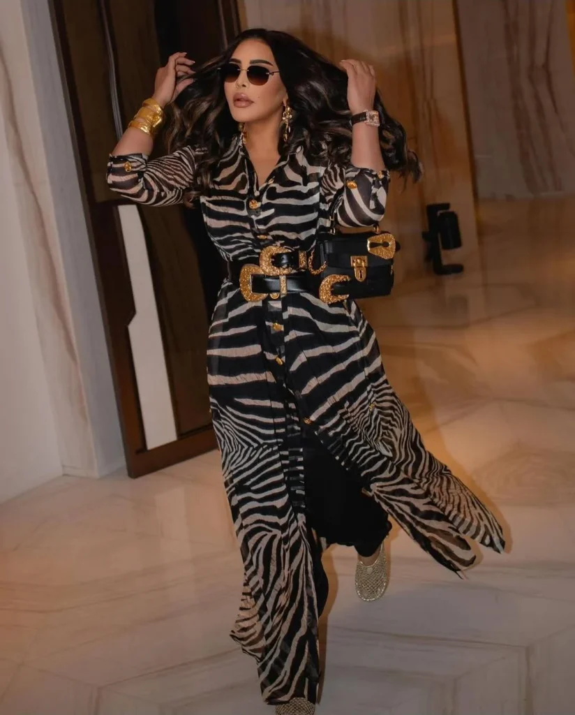تبرز النجمة الإماراتية أحلام الشامسي بإطلالة مميزة اختارتها من دار سكيابارلي. يتجسد الاختيار في فستان على شكل قميص طويل بأزرار ذهبية كبيرة ونقشة زيبرا في الأكمام الطويلة، مع بنطال واسع ذو طرف ضيق مزين بالأزرار الذهبية أيضاً. يبرز الخصر بحزامين من الدار نفسه يحملان بابازيمين باللون الذهبي، ما أضفى رونقاً خاصاً على الإطلالة. وتكتمل الإطلالة بحقيبة يد سوداء صغيرة من الدار مع المفتاح الذهبي الشهير وبابزيم ذهبي عريض، وحذاء ذهبي لامع بلا كعب، إضافة إلى أقراط طويلة وأساور ذهبية متعددة الأحجام والتصاميم، ليظهر الشكل مزيجاً من الكاجوال الأنيق والعصري.