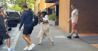 كانت ترتدي ملابس كاجوال مريحة وتحمل حذاءها في يدها، وترافقها أربعة حراس شخصيون أيضًا بملابس مريحة.