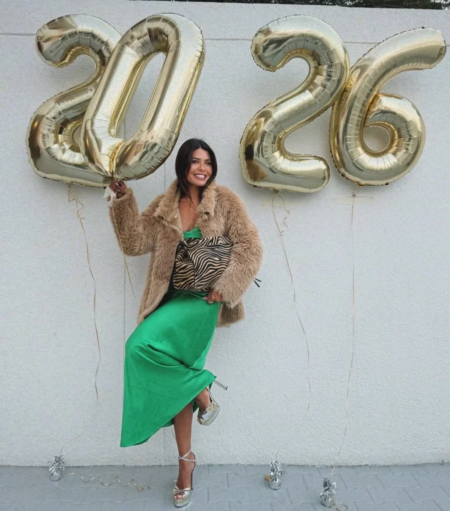 اختارت العنود بدر فستاناً أخضر بقصّة انسيابية يعكس بساطة أنيقة وأنوثة واضحة، وتُوّجت الإطلالة بجاكيت فرو باللون البيج أضفى دفئاً وفخامة. ما ميز اللوك إضافة حقيبة كبيرة بنقشة الزيبرا بالأسود والبيج، مما منح الإطلالة طابعاً معاصراً ومبتكراً. وتكاملت العناصر مع تفاصيل دقيقة تعكس خيطاً من الفخامة غير المبالغ فيها في موسم الشتاء.