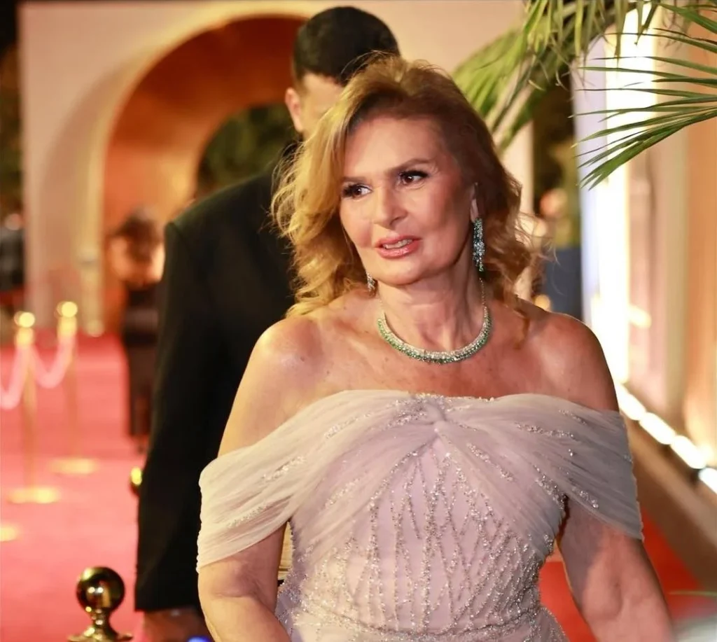 ارتدت يسرا فستاناً باستيلياً وردياً من قماش التول المطرّز بخيوط ذهبية لامعة. جاء التصميم ضيقاً من الأعلى ومكشوفاً عند الأكتاف مع طيات ملتفّة حول الصدر تشبه أكماماً منسدلة. أكملت الإطلالة بحقيبة ذهبية من نوع كلاتش ومجوهرات ماسية فخمة أضافت لمسة من الفخامة والرقي.