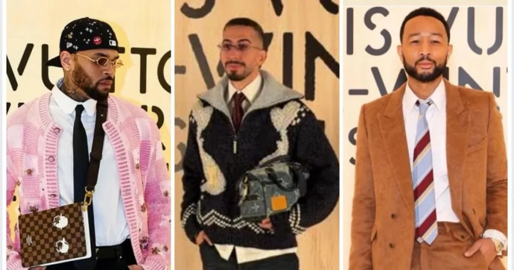 تألّق جون ليجند بإطلالة كلاسيكية دافئة بألوان ترابية. ارتدى طقمًا تقليديًا مع قميص أبيض وربطة عنق مقلمة بالأزرق والكاميل. أضاف حقيبة من لويس فويتون باللونين الأزرق والكاميل ليكمل الإطلالة بذوق فاخر متوازن.