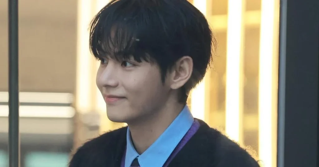 أبرزت دار سيلين إطلالة كيم تايهونغ Kim Taehyung في حدثها الشتوي مع إبراز هوية الدار وبصمتها الواضحة. اعتمدت الإطلالة على طبقات بسيطة وغير مبالغ فيها لتسليط الضوء على فكرة الـ Layering الشتوية. اختار كيم تايهونغ قميصاً باللون الأزرق الفاتح بياقة كلاسيكية كقاعدة هادئة، وفوقه طبقة توب صوفية بنفسجية تضيف لمسة حيوية دون أن تطغى على الإطلالة. أما الطبقة الثالثة فكانت جاكيت صوف أسود بتصميم ريتر يذكّر بطابع المدرسة مع ياقة V وأزرار أمامية، ما يعزز الدفء والعملية مع لمسة نهائية بسيطة بسلسلة ذهبية رفيعة مع Pendant صغير.