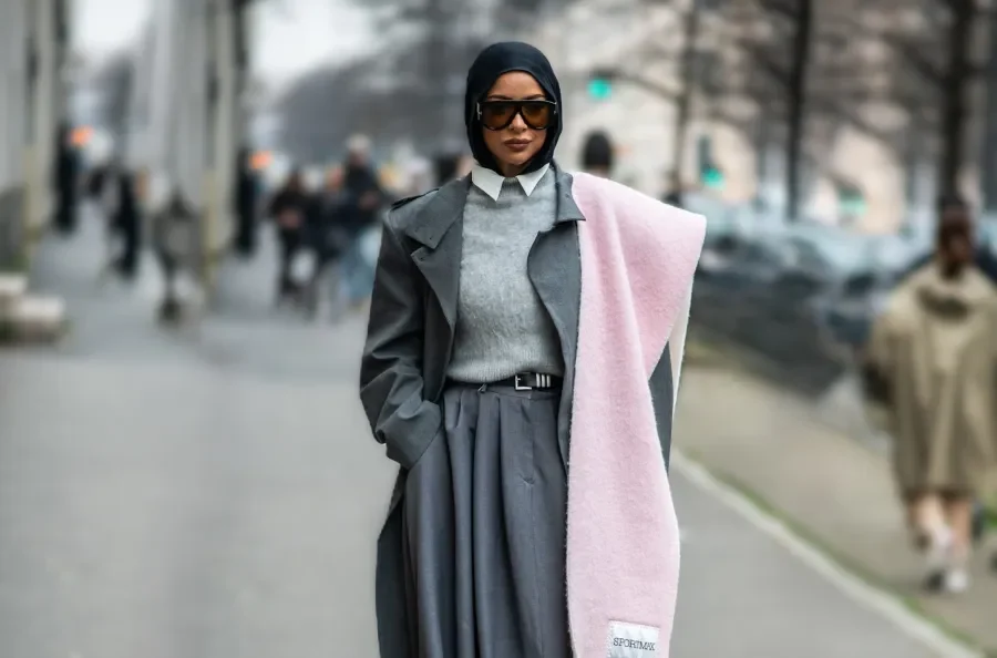 وللنقل إلى ميلانو، ظهرت سهى في عرض Sportmax ببدلة أوفرسايز رمادية مع أكسسوارات سوداء وشال صوف بلون باستيل زهري، لتؤكد توازناً أنيقاً بين الحداثة والدفء الرمضاني وتفاصيل القصّة عند الخصر التي تُبرز التناسق دون الإخلال بالاحتشام.