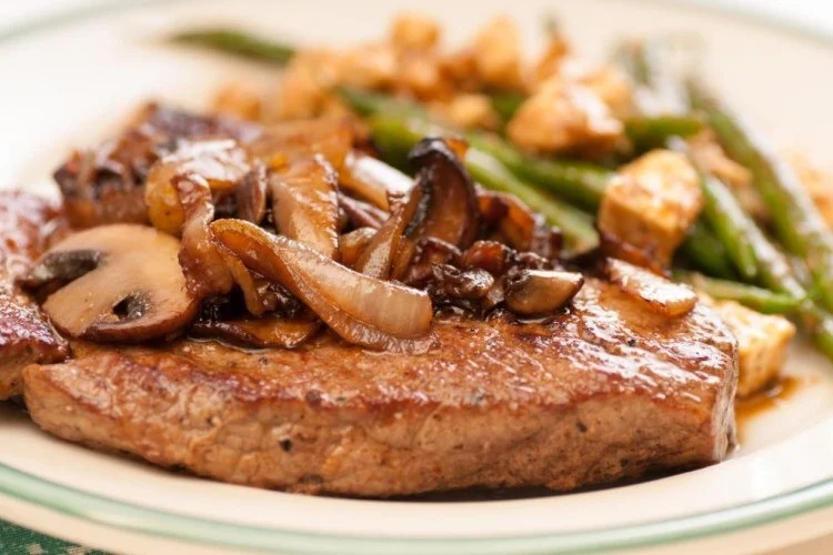 لتحضير الصوص، يشوّح الطاهي الفطر المقطع في نفس المقلاة لعدة دقائق ثم يضاف مرق اللحم ويترك حتى يثخن القوام قليلاً. يُعاد اللحم إلى طبق التقديم وتُسكب فوقه الصوص وتُقدَّم الأكلة وهي ساخنة. تُقدَّم الوجبة مع بطاطس كجانب أو خضار لإكمال النكهة.