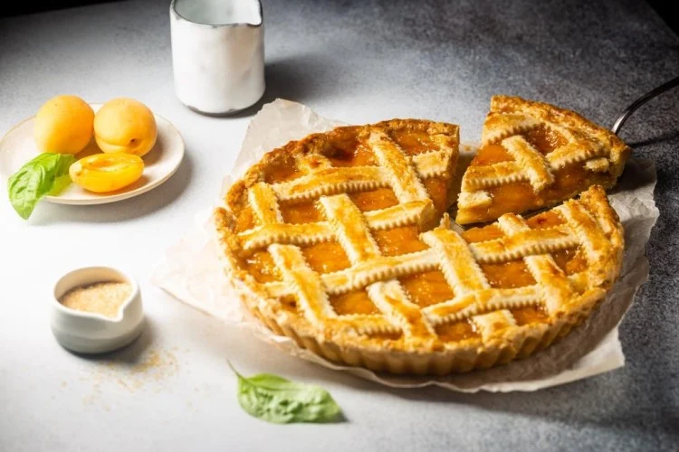 افردي ثلث العجينة في قالب مدهون بالزبدة، ثم وزّعي المربى فوقها بالتساوي. افردي باقي العجينة وقطعيها إلى شرائط، ثم ضعيها على الوجه بشكل متشابك. اخبزي في فرن مسخن مسبقاً على درجة 180 مئوية لمدة 25–30 دقيقة حتى تكتسب اللون الذهبي. اتركيها لتبرد قليلاً، ثم قطعيها وقدميها.