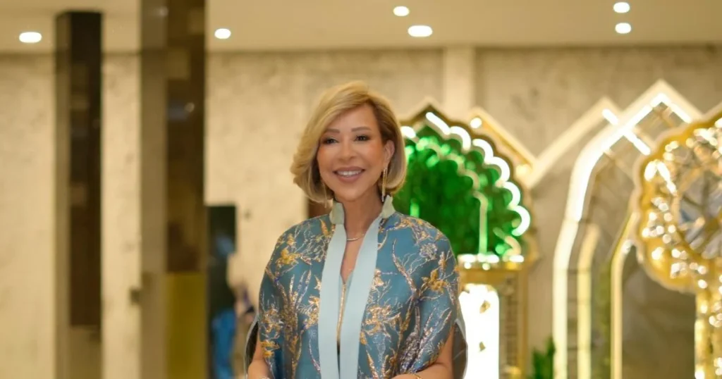 اختارت نعمت عون قفطانًا باللون الأزرق بخطوط واسعة تمنح الإطلالة انسيابية وفخامة. زُيِّن بتفاصيل ذهبية جميلة أضافت لمسة ملكية ناعمة. انفتحت الأكمام متوسطة الطول مع فتحة جانبية لتعزز الطابع العصري مع الحفاظ على الروح الشرقية، فيما جاءت الحواف والياقة العالية باللون الأزرق الفاتح مكملة للدلالة اللونية. نسّقت تحت القفطان فستانًا باللون الأزرق الباستيلي، تميز بلمسة ذهبية ناعمة انسجمت بسلاسة مع التطريز، فخلق تناغمًا لونيًا أنيقًا ومتوازنًا.