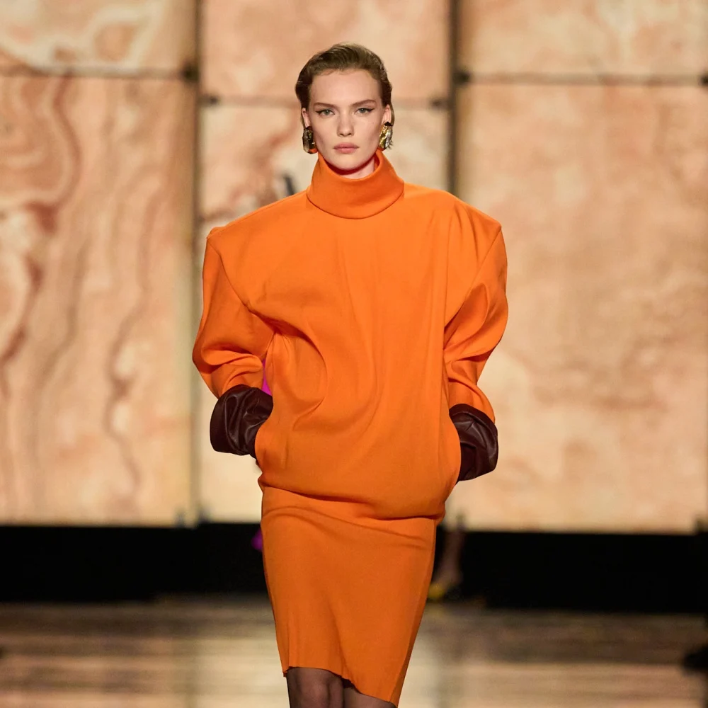 تقدم Saint Laurent بلوزة كتف عريض باللون الأحمر مع تنورة برتقالية لإطلالة جريئة وأنثوية في الوقت نفسه. يبرز الانطباع القوي من خلال الأكتاف العريضة وتباينات لونية جريئة. يمكن اعتماد هذه الإطلالة لسهرات المساء أو المناسبات الخاصة. تجمع القطعة بين الجرأة والأنوثة وتمنح لوكاً مكتمل العناصر.