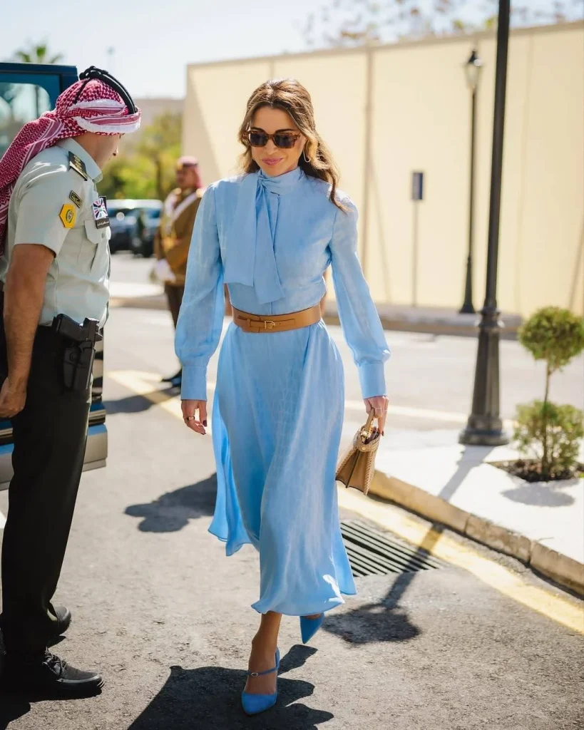 حضرت الملكة رانيا افتتاح الدورة العادية الثانية لمجلس الأمة العشرين، وتألقت بإطلالة تجمع بين البساطة والأناقة. ارتدت فستاناً ناعماً باللون الأزرق السماوي، ضيق من الأعلى بأكمام طويلة وياقة عالية مزينة بعقدة جانبية متدلّية. انسدل الفستان المطبع بقصة انسيابية واسعة وتحديد الخصر بحزام عريض من الجلد باللون البيج الغامق. أكملت الإطلالة بحذاء مخملي مدبب وبحقيبة جلد بنفس اللون مع أقراط مرصعة طويلة وخواتم بسيطة.