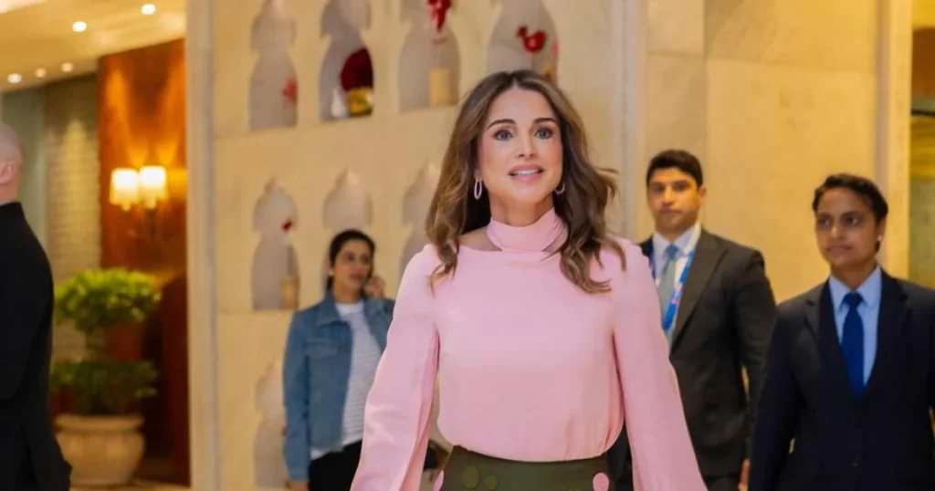 حضرت الملكة رانيا اليوم في نيودلهي للمشاركة في قمة الأعمال العالمية التي تستضيفها تايمز الاقتصادية. أبرزت الإطلالة الحيوية ألوانها المميزة التي تعكس شخصيتها الكلاسيكية والأنيقة في الوقت ذاته. تألقت بتوب زهري بقصة ناعمة وأكمام واسعة مع ياقة مرتفعة وعرض لطيف عند الأكتاف. نسّقت التوب مع تنورة كلاسيكية باللون الأخضر الزيتي مزدانة بنقاط البولكا دوت بلونين زهري وزيتوني وتغطيها طبقة شيفون شفافة أضافت لمسة أنيقة.