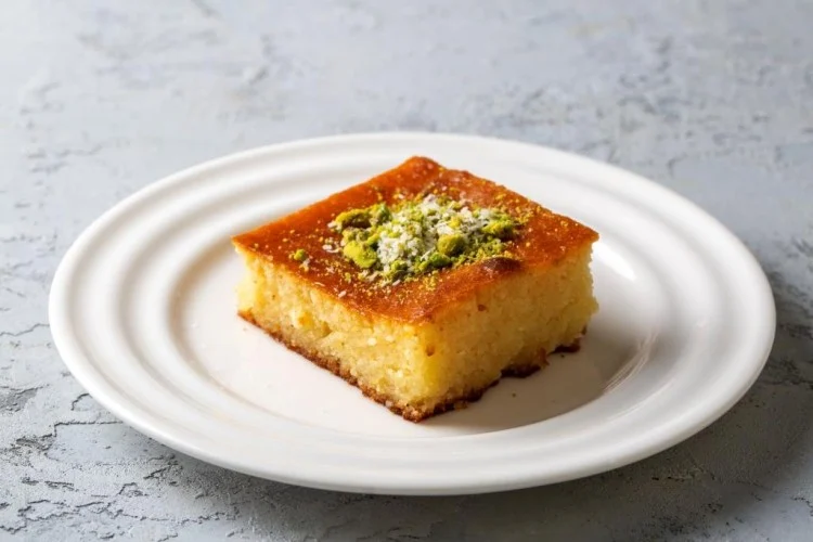 ينخل الشيف السميد الناعم بمقدار 2 كوب مع نصف كوب سكر ونصف كوب جوز الهند وبيكنج بودر بمقدار ملعقة كبيرة. يضيف الشيف كوب لبن زبادي ونصف كوب سمن بلدي. يضيف الشيف القشطة حوالي 170 غ. يخلط الشيف حتى يتكوّن خليط متجانس.