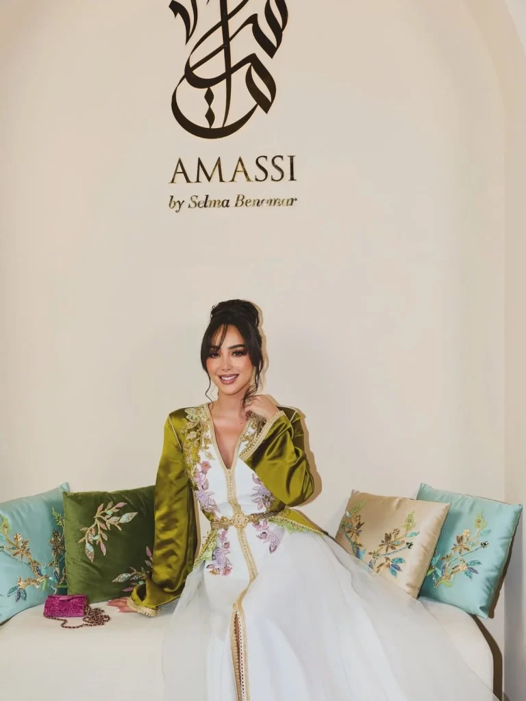 تناغم القفطان مع كلوثش ناعم من المخمل باللون الفوشيا أضاف لمسة أنثوية راقية، مع سلسلة ذهبية طويلة تكمل الإطلالة وتؤكد اختيارها للفخامة. ينحدر القفطان من الأعلى إلى الأسفل بسلاسة مع طبقات من التول، ويفتح أمامياً بشكل ناعم يبرز الأنوثة. أبرزت الحِرفة المغربية التقليدية وتفاصيل التصميم الرفيع، مما يجعلها قدوة في صيحات رمضان 2026.