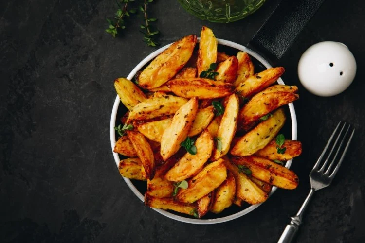 تخلط شرائح البطاطس في وعاء واسع مع التوابل حتى تتغلف الشرائح بالتوابل. توضع الشرائح في سلة القلاية الهوائية في طبقة واحدة قدر الإمكان. يُطهى على 200 مئوية لمدة 18–20 دقيقة، مع تقليب الشرائح نصف المدة لضمان تحمير متساوٍ ومقرمش من جميع الاتجاهات. قدمي البطاطس والدجز المشوية ساخنة مع الصوص المفضل.