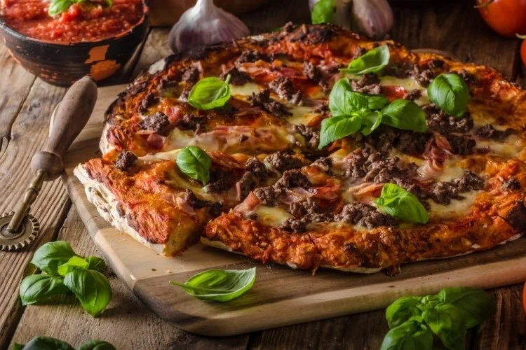 تفرد العجينة في صينية مدهونة بالزيت وتُترك الأطراف فارغة قليلًا. تُوزّع صلصة البيتزا بالتساوي على سطح العجين وتُترك الحواف فارغة. يوضع اللحم المفروم فوق الصلصة ثم تُرش جبنة الموزاريلا والزعتر البري على الوجه. تُدخل الصينية إلى فرن محمى مسبقًا على درجة حرارة 200 مئوية لمدة 15-20 دقيقة حتى تنضج العجينة وتذوب الجبنة وتتحمر الأطراف.