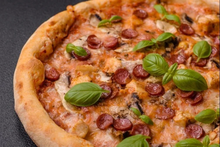 حمّي الفرن على درجة 200 مئوية استعداداً للخبز. افردي العجينة في صينية فرن مدهونة بقليل من الزيت، ثم ادهنّي الصلصة على سطحها ووزّعي النقانق والفلفل الرومي والزيتون وأخيراً جبن الموزاريلا المبشور. اخبزي الصينية في الفرن لمدة 15 إلى 20 دقيقة حتى تنضج وتذوب الجبن. قدمي البيتزا ساخنة وقطّعيها بشكل متساوٍ للاستمتاع بالنكهة والقوام المتوازن.
