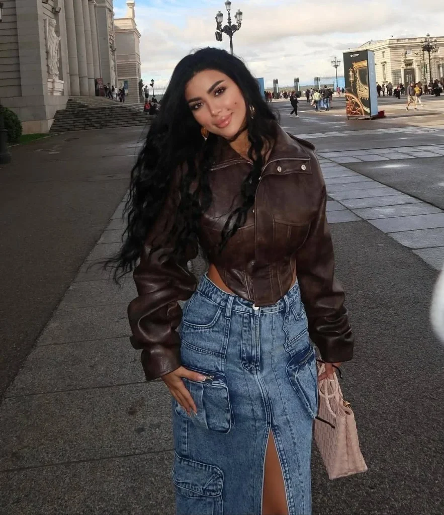 أطلت كارولين عزمي بإطلالة ناعمة أثناء تجولها في شوارع إسبانيا. اعتمدت جاكيتاً قصيراً بقصة الكورسيه من الجلد البني مع أكمام طويلة وواسعة، وفتح عند الخصر ليضيف لمسة أنثوية وجريئة. نسقت معه تنورة طويلة وضيقة من الجينز تتميز بجيوب بارزة وفتحة أمامية عالية، ما يضيف جرأة إضافية إلى الطلة. وأكملت طلتها بشعر أسود طويل ينسدل بخفة على كتفيها، وتماشى مكياجها الترابي مع خدود برونزية ولون شفاه غلوسي لامع. كملت طلتها باختيار حذاء بوت أبيض طويل بتصميم راعي البقر، إضافة إلى حقيبة نيود، ونظارة شمسية سوداء، وأقراط ذهبية كبيرة.