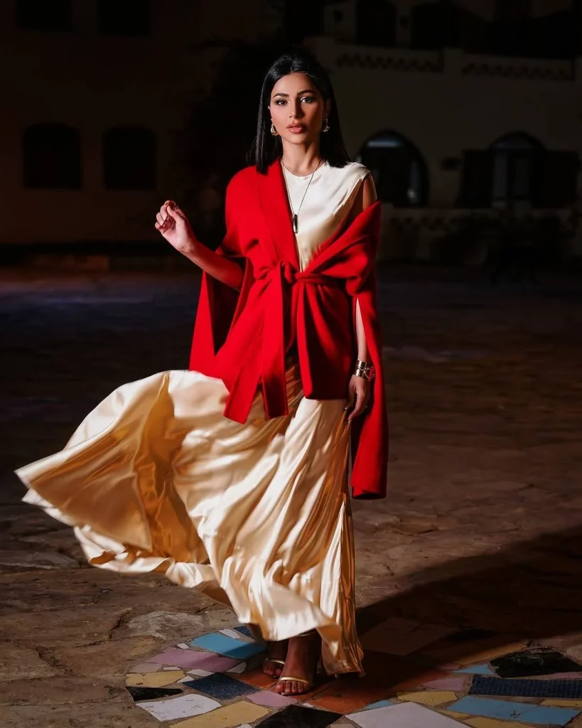 اختارت الإعلامية الإماراتية مهيرة عبد العزيز فستاناً من الحرير باللون الذهبي الفاتح ليطلّ على حفل خاص أقيم في مصر ضمن أجواء أعياد الميلاد ونهاية العام. صُمم الفستان بتصميم بسيط وأنيق مع حمالات عريضة وضيق من الأعلى، ثم يتسع كتنورة واسعة عند الأسفل ليضفي حركة ورقّة. أتمّت الإطلالة بمعطف أحمر ملفت بتصميم جريء مع أكمام مفتوحة وحزام عريض لإضفاء لمسة حادّة وتوازن جمالي. هذه الإطلالة تعكس اختياراً كلاسيكياً مناسباً للمناسبات الاحتفالية وتبرز بساطة الأناقة كخطٍ أساسي.