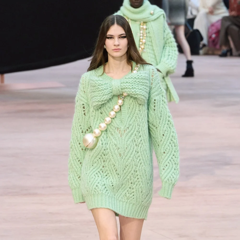 تعود لمسة اللؤلؤ إلى الظهور هذا الشتاء كتعبيرٍ عن الفخامة الهادئة والأنوثة الكلاسيكية التي لا تفقد رونقها عبر الزمان. يبرز اللؤلؤ كحالة من الصفاء تتناغم مع هدوء الشتاء ودفئه، وتمنح الملابس الثقيلة إشراقاً ناعماً. تصدر قطع مزينة باللؤلؤ من علامات مثل Mach & Mach وAlaïa المشهد، لتكمل التباين بين النعومة والدفء. يمثل اللؤلؤ، في هذا الموسم، إضافة رصينة لا تعتمد على الصخب لتلفت الأنظار.