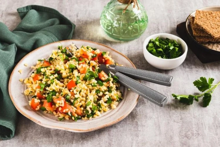 يغسل الطاهي البرغل في مصفاة ناعمة ثم يضعه في وعاء صغير ويضيف إليه عصير الليمون وملعقة كبيرة من زيت الزيتون ليتركه ليمتص السوائل لمدة 15–20 دقيقة. تقطع الطماطم إلى مكعبات وتضيفها ربة المنزل إلى الوعاء مع رشّة الملح وتحتفظ العصارة الناتجة. تغسل ربة المنزل البقدونس والنعناع جيداً وتُجففان ثم تُفرم الأوراق فرماً ناعماً وتخلط مع البصل الأخضر المفروم. يقوم الطاهي بجمع الأعشاب مع البرغل المنقوع والطماطم مع العصارة ثم يضيف التتبيلة المتبقية ويقلب المزيج برفق. تترك ربة المنزل السلطة في الثلاجة لمدة لا تقل عن 30 دقيقة حتى تتجانس النكهات.