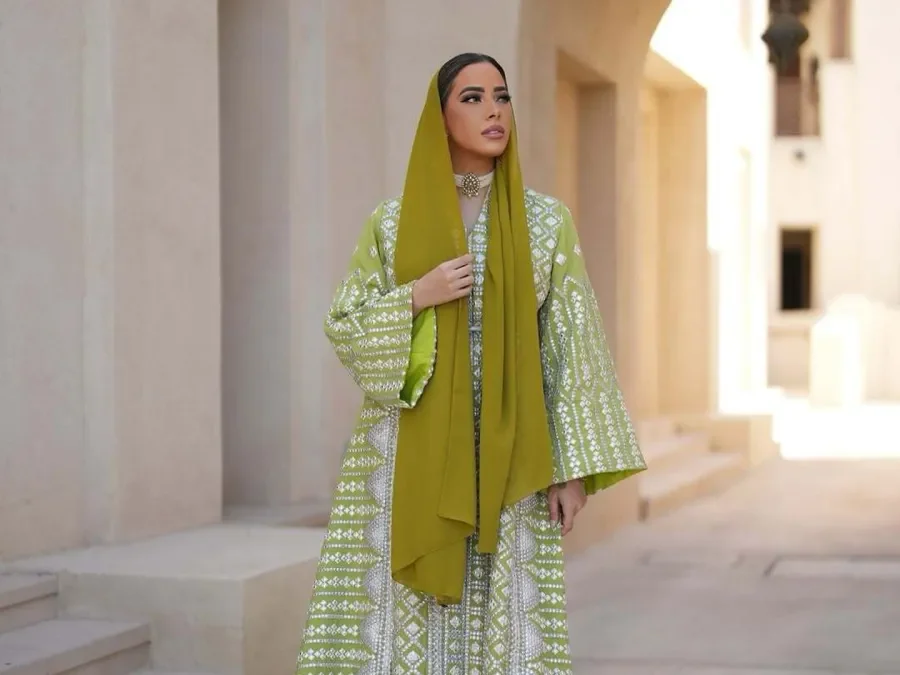 اختارت مدونة الموضة حنين الصيفي قفطاناً من التركوازي العميق يعكس أجواء رمضان الراقية. جاء القفطان بصيغة انسيابية ناعمة وتطريزات ذهبية رقيقة عند الأكمام وحافة الياقة أضفت لمسة فاخرة بدون مبالغة. اعتمدت الحجاب بدرجة قريبة من لون القفطان مع لفّة بسيطة، ونسّقت الحقيبة الذهبية الكلااتش مع حذاء مطابق لإبقاء التدرّج اللوني متوازنًا.