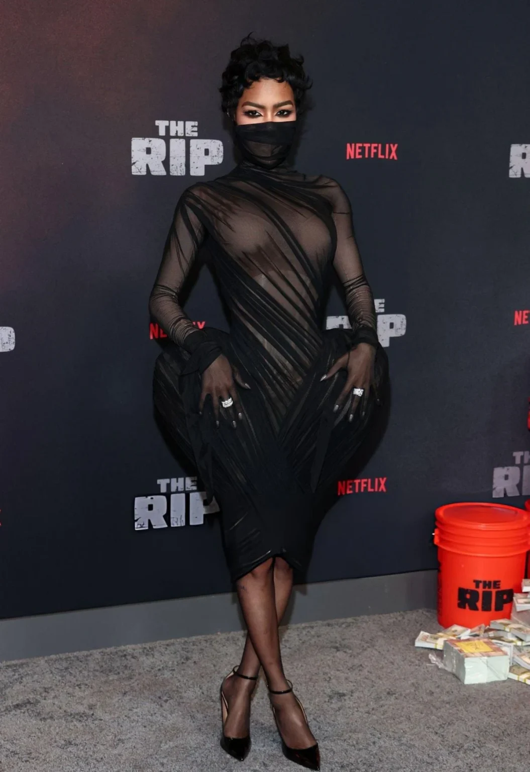 يتكوّن الفستان من قماش شبكي أسود يلتف بانسيابية حول منحنيات الجسد بأسلوب طبقات مائلة، مع ثنيات مجمَّعة وتصميم مكشَّش يضيف لمسة فريدة. يبرز التصميم جانبي الخصر والوركين بتفاصيل مميزة تشدد على جمالهما. أما الياقة العالية فتوحي بالرقي، كما يدمج قناع وجه يغطي النصف السفلي من الوجه بسلاسة مع الإطلالة. اختتمت تايانا الإطلالة بحذاء أسود عالي الكعب لإكمال المظهر.