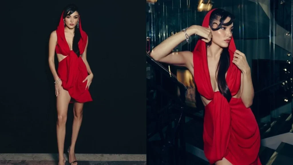 اعتمدت هاندة فستان هودي أحمر بتصميم جريء مع فتحة صدر كبيرة، ما أضفى جرأة إضافية على الإطلالة ولُقّظ اللون الأحمر القوي كعنصر يلفت الانتباه. يكسر هذا الخيار التقليدي ويحمل طابعاً عصرياً ينسجم مع أسلوبها الواثق. أكملت الإطلالة بتنسيق أنيق وتفاصيل مكياج تتناسب مع اللون اللافت.