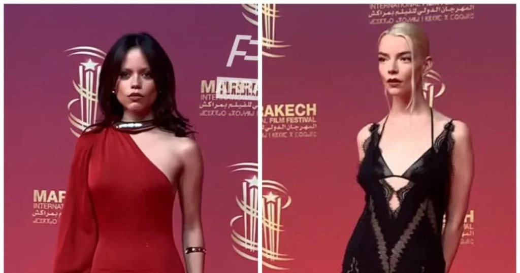 اخترت آنا تايلور-جوي فستاناً أسود شفافاً من Tom Ford ضمن مجموعة ربيع وصيف 2026. يتكوّن من دانتيل رقيق وقصة Slip كلاسيكية تنساب برقة. مع ياقة عميقة تكشف طبقات من الشفافية وتستحضر روح الآرت ديكو من خلال خطوطه الهندسية الدقيقة. كانت الحمالة السوداء الظاهرة جزءاً من بنية الإطلالة نفسها، حيث ظهرت بخط Halter رفيع ولوحة شفافة تتناغم مع ملمس الفستان.