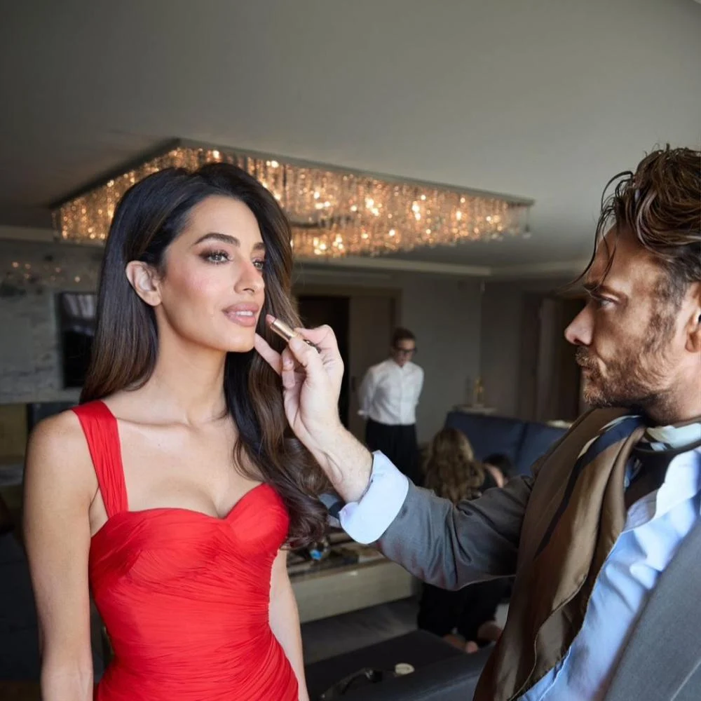 كواليس مكياج أمل كلوني ارتكزت على مستحضرات Charlotte Tilbury مثل Magic Cream لإتاحة ترطيب عميق وبناء طبقات فرعونية من الأساس، مع توحيد البشرة بواسطة Airbrush Flawless Foundation 6N + 8N وAirbrush Flawless Blur Concealer 9.5، إضافة إلىContour Wand – Medium وAirbrush Flawless Finish – 2 وBeauty Light Wand – Spotlight لتحديد الضوء الطبيعي حول الوجه، وكذلك روتين العيون والشفاه من مجموعات تتوافق مع الإطلالة الكلاسيكية. كما أضيفت لمسة خاصة بلمسة جورج كلوني من Magic Serum Crystal Elixir وكريم Magic Cream وGlossات نهائية لإطالة ثبات المكياج.