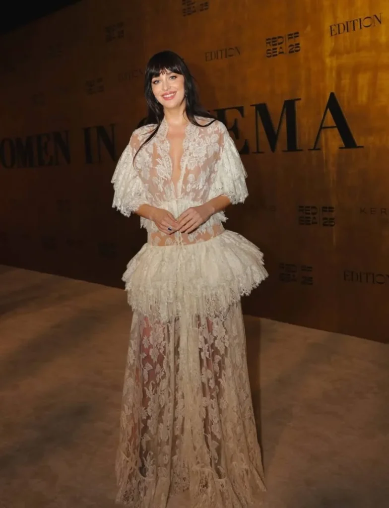 ارتدت داكوتا جونسون فستانًا أبيض شفافًا من الدانتيل من دار كلوي، فستان يتميز بتصميم دانتيل فخم وشفاف مع كشكشة ونقوش رشيقة. ينسدل الفستان من منطقة الورك بشكل كشكش متدرج ثم يمتد إلى الأرض مع تنورة واسعة من الدانتيل المخرّم. أكملت النجمة الإطلالة بمجوهرات رقيقة تضمنت أقراط وخاتم مرصعين بأحجار كريمة باللون الأزرق الملكي أضفت فخامة على الإطلالة. اختتمت داكوتا مظهرها بشعرها الأسود الطويل المنسدل على ظهرها مع غرة أمامية ومكياج وردي ناعم يبرز ملامحها من دون مبالغة.