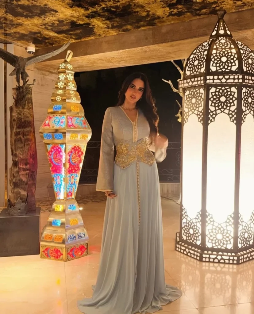 ظهرت النجمة درة زروق في أحدث إطلالة مميزة بقفطان مغربي أنيق باللون الرمادي. يتميز القفطان بقصة ضيقة من الأعلى وأكمام واسعة وتنسدل من الأسفل بشكل واسع مع تطريزات ناعمة في الوسط. يبرز الحزام العريض المطرّز بأسلوب شرقي باللون الذهبي تفصيلاً مميزاً أضاف لمسة من الفخامة على القفطان. واكملت درة الإطلالة بتسريحة شعر كلاسيكية بنمط ويفي ناعم ومكياج هادئ بلون برونزي مع احمر شفاه وردي نيود.