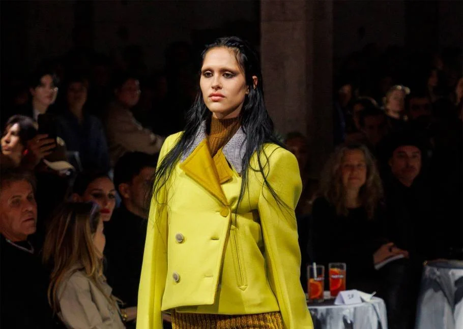 أما تقنية الـ Color Blocking فتبقي لكنها تُطبق بأسلوب أكثر تطوراً داخل الإطلالة الواحدة عبر تدرجات متعددة وتفاصيل خياطة ونقوش تمنح الألوان انسجاماً فنياً. اختارت دار Dries Van Noten مثالاً واضحاً، حيث جمعت الأصفر الخردلي مع الأخضر الزيتي ولمسات من الأسود عبر تصاميم هندسية بطابع معماري، ما أكسب الإطلالات إحساساً بالحياة مع دفء الشتاء.