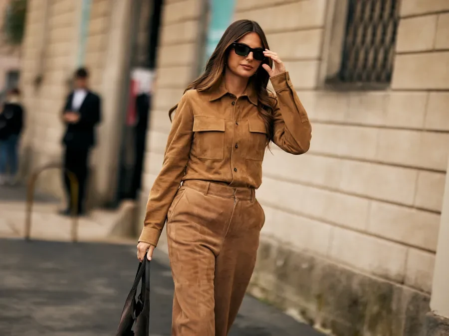 تتبنى الموضة قماش السويد في إطلالات شتاء 2026 وتظهر كخيار عملي يمكن اعتماده في أجزاء عدة من الإطلالة. يمكن تنسيق قميص وسروال مستقيم القَصة من السويد الجملي مع حقيبة Tote بنية داكنة من نفس الخامة وتكمل الإطلالة بنعل جلدي بني قصير الرقبة لإضفاء لمسة أنيقة. هذه الخامة تعزز الدفء والراحة مع الحفاظ على مظهر عصري متوازن.
