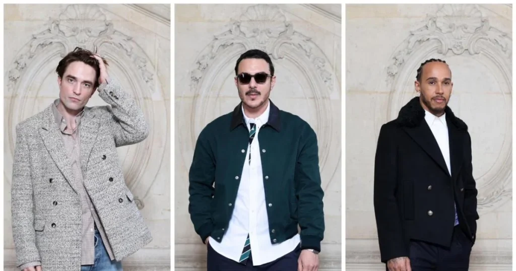 جاء روبرت باتينسون بإطلالة تحمل روح الرجل العصري، مرتدياً جاكيت تويد رمادية مزدوجة الصدر بياقة حادة، مع قميص قطني بني بنقشة مربعات وبنطال جينز أزرق. هذا المزيج بين التويد الكلاسيكي والدنيم اليومي يعكس فلسفة ديور الجديدة التي تكسر القواعد دون التخلي عن الأناقة. الإكسسوارات أضافت لمسة فاخرة متوازنة.