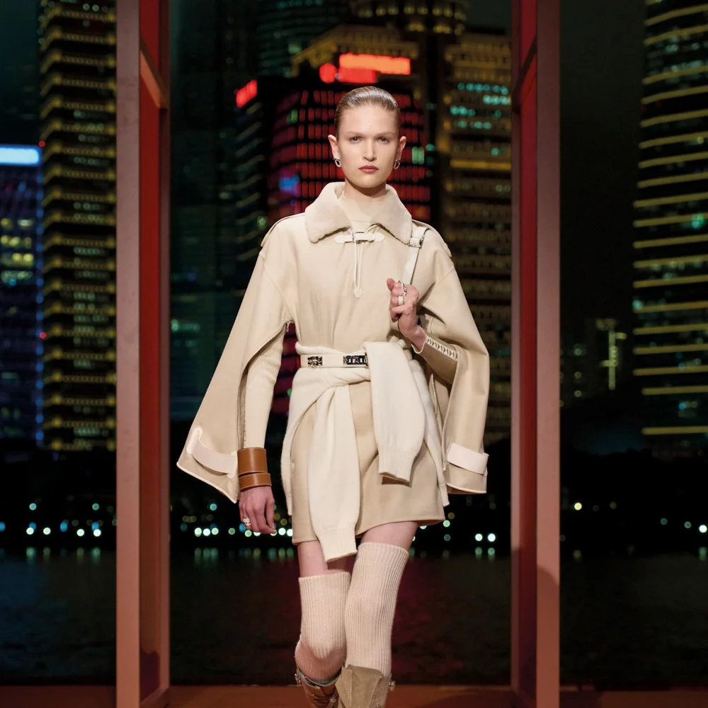 أما هيرمس فقدمّت الصيحة بأسلوب راقٍ وهادئ عبر ربط معاطف خفيفة أو كنزات صوفية حول الخصر. الربطة هنا ليست عشوائية بل هي وسيلة لتحديد الخصر بطريقة مواكبة للموضة وتوازن بين الخامات والقصّات. تعكس هذه الطريقة أناقة هادئة ذات طابع كلاسيكي ينسجم مع روح الدار.