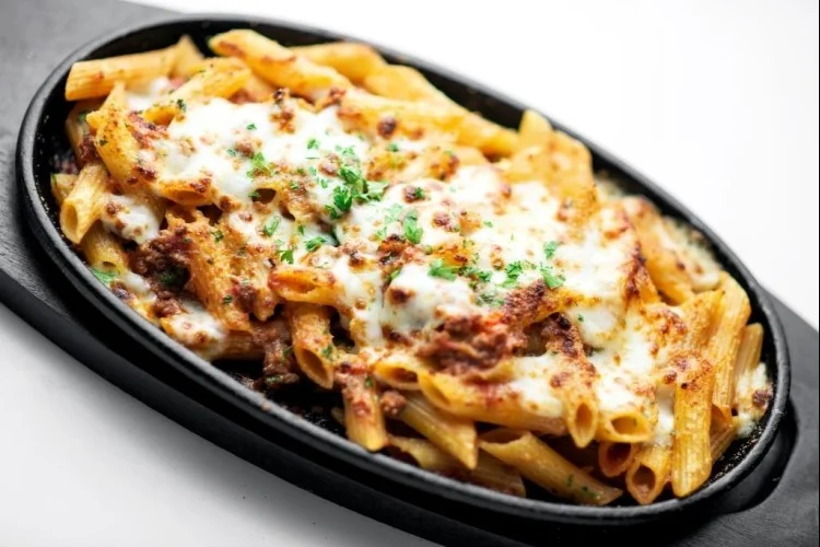 ابدأ بسلق الباستا في قدر مملوء بالماء حتى النضوج، ثم صفيها واتركها جانباً. أذب البصل مع زيت في قدر على نار متوسطة حتى يلين، ثم أضيفي الثوم وقلّبيه لبضع ثوانٍ. اقلي اللحم المفروم حتى يكتسب اللون البني ويختفي اللون الوردي، ثم أضيفي البهارات الإيطالية والملح والفلفل وصلصة المارينارا وخففي الحرارة، واتركي المكونات تطهى حتى تمام النضج. ارجعي إلى الباستا المطبوخة، أضيفيها مع الصلصة ثم وزعي نصف كمية الخليط في طبق خبز ونصف كمية الجبن، ثم كرري العملية مع النصف المتبقي.