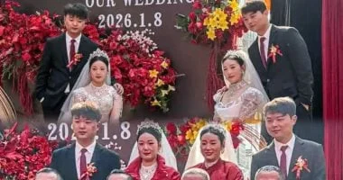 شهدت الصين حفل زفاف يجمع شقيقين توأمين مع شقيقتين توأمتين، وهو ترتيب نادر أثار دهشة المجتمع. كما ظهرت في اللقطات العائلية أربع مجموعات من التوائم مجتمعين في مناسبة واحدة، وهو ما وصفه المنظمون بأنه تلاحم عائلي مميز. وانتشرت صورة الزفاف على نطاق واسع عبر الإنترنت محققة أكثر من 10 ملايين مشاهدة، ما كان له صدى كبير بين المتابعين. وأوضح المنظمون أن وجود أعمام توأمين بجانب العريسين يضفي على الحدث طابعاً استثنائياً.