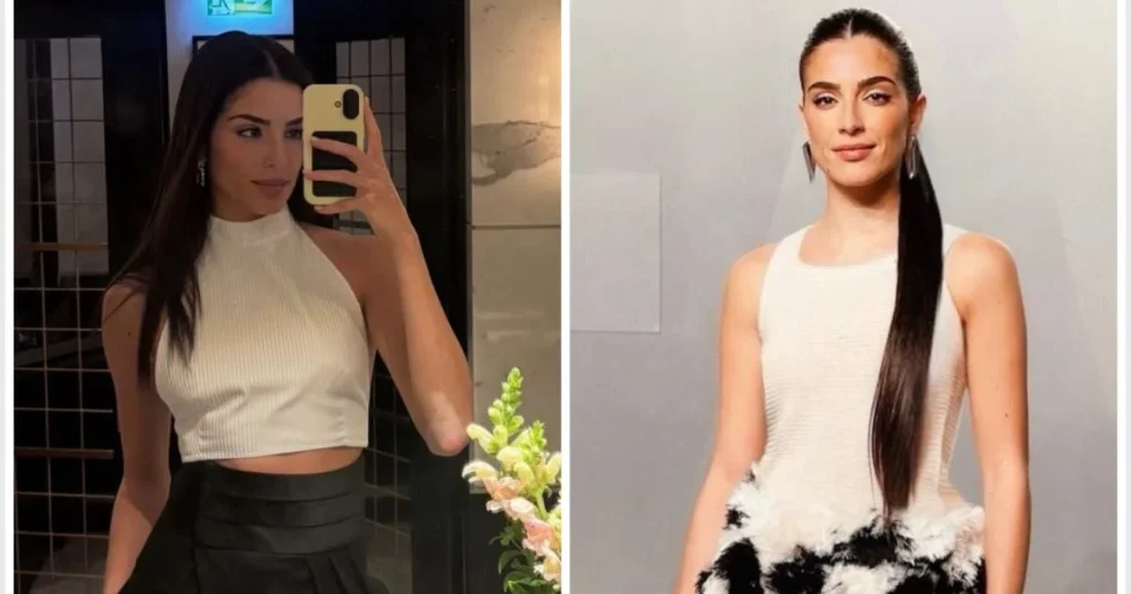 في إطلالة عصرية لافتة، ارتدت كروب توب أبيض برقبة عالية وتنسيقًا مع بنطلون أسود واسع مستوحى من تصميم الشروال. تميّزت القصة بخصر عريض وتفاصيل ملتفة، ما منح الإطلالة طابعًا يجمع بين الجرأة والأصالة. تعكس هذه المجموعة قدرة سجى على المزج بين الحداثة والتقاليد بنسق أنيق.
