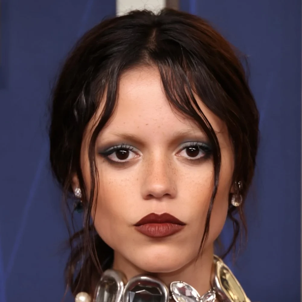 تلفت Jenna Ortega الأنظار بإطلالة مخملية مع أحمر الشفاه القوي واللامع ومكياج عيون أزرق بارز. تعتمد خطوط كونتور مخملية رفيعة على الأطراف الخارجية لإبراز حجم الشفاه بشكل جذاب، مع تمرير اللون على أسفل الجفون لإعطاء العينين اتساعاً ملفتاً. تتناسب هذه الإطلالة مع البشرة الحنطية وتكتمل بخطوط كحل سوداء رفيعة على الجفون العليا لإبراز التفاصيل بدون سحب امتداد الخط نحو الخارج.