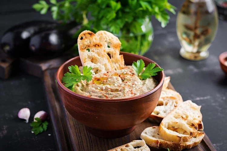 يجهّز الشيف سلطة باذنجان مشوي بتتبيلة بسيطة ومميزة. تتضمن المقادير باذنجانَين متوسطَين، وثلاث ملاعق كبيرة من زيت الزيتون، وفصّ واحد من الثوم المهروس، ونصف حبة من الليمون لعصيرها، وملح وفلفل حسب الرغبة، إضافة إلى ملعقة كبيرة من البقدونس المفروم ورشة سماق. يجهّز الشيف المقادير قبل البدء لضمان اندماج النكهات وتحضيرها بشكل مناسب.