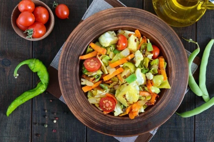 اخلط الطماطم والخيار والبصل والجزر والفلفل الأخضر في وعاء للخلط. أضف عصير الليمون وزيت الزيتون والملح والكمون، ثم قلب السلطة حتى تتجانس المكونات. قدمها وهي طازجة فور التحضير.