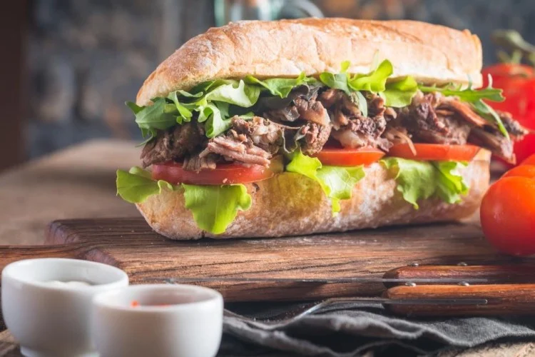 يقدم هذا الوصف مقادير ساندويش شرائح اللحم بشكل واضح ومبسّط. اللحم: شريحة ستيك ريب آي تُفرد باستخدام مطرقة اللحم حتى تصبح طرية وتكون جاهزة للطبخ، مع البصل حبة صغيرة تقطع إلى شرائح والفلفل الملون نصف حبة تقطع شرائح. الثوم: فصّان كاملان مع زيت الزيتون بمقدار 2 ملاعق كبيرة و صلصة الصويا ملعقة كبيرة، مع الملح والفلفل الأسود حسب الرغبة. الخبز حسب الحاجة وخضار مشكلة حسب الرغبة وصلصات حسب الرغبة كاختيار.