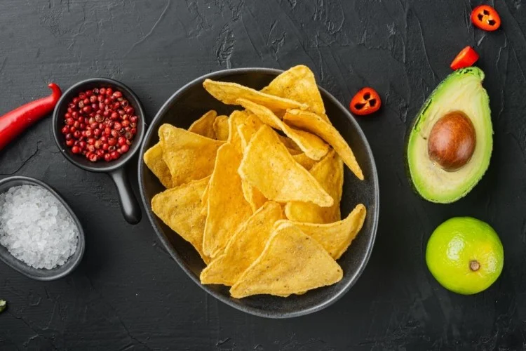 يُسخن الفرن إلى 180 مئوية. يُفرد العجين بين ورقتي زبدة حتى سماكة نحو 3 ملم. يُقطّع المستطيل إلى شرائح تشبه الشيبس. يُرص الشرائح على صوانيت مبطنة بورق الزبدة. تُخبز الشرائح لمدة 10–12 دقيقة حتى تكتسب لوناً ذهبياً ومقرمشة، ثم تُترك لتبرد قليلاً قبل التقديم.