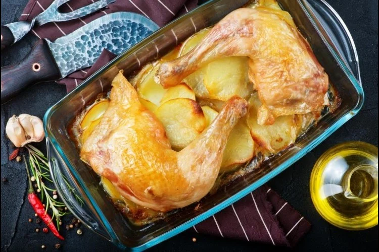 ضعي شرائح البصل والطماطم جانباً للتحضير. رتّب في الصينية طبقاً من البطاطس كقاعدة ثم أضيفي الدجاج ثم البصل ثم الطماطم فوقها. اسكب ماء المرق مع عصير الليمون على الصينية لتبقى رطبة أثناء الخبز.