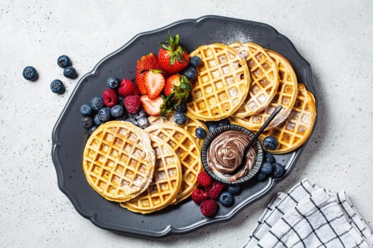 ابدأ بتحضير مقادير عجينة الوافل كما تُباع في المحلات. الدقيق الأبيض: 2 كوب من متعدد الاستعمالات، والسكر: 2 ملاعق كبيرة، والبيكنج بودر: ملعقة صغيرة، والملح: ربع ملعقة صغيرة. البيض: 2 حبة بدرجة حرارة الغرفة، والحليب: كوب وربع، والزبدة المذابة: ربع كوب، والفانيليا: ملعقة صغيرة. للتزيين، اختر الشوكولاتة حسب الرغبة، والفواكه حسب الرغبة، والعسل حسب الرغبة.