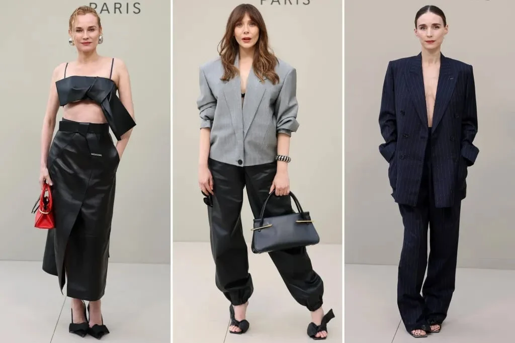 تتجلّى إطلالة ديان كروغر في قطعتين من الجلد الأسود. التوب قصير المنحوت مع أشرطة رفيعة وتفاصيل تشبه فيونكة مطوية تتدلّى على جانب واحد. تكتمل الإطلالة بتنورة عالية الخصر من الجلد نفسه مع فتحة أمامية. تَضيف الحقيبة الحمراء وباقي الإكسسوارات لمسة جاذبية تضمن الراحة في الصف الأمامي والحركة أثناء الجلوس.