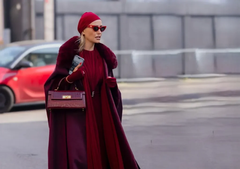 الفستان العنابي والمعطف البنفسجي