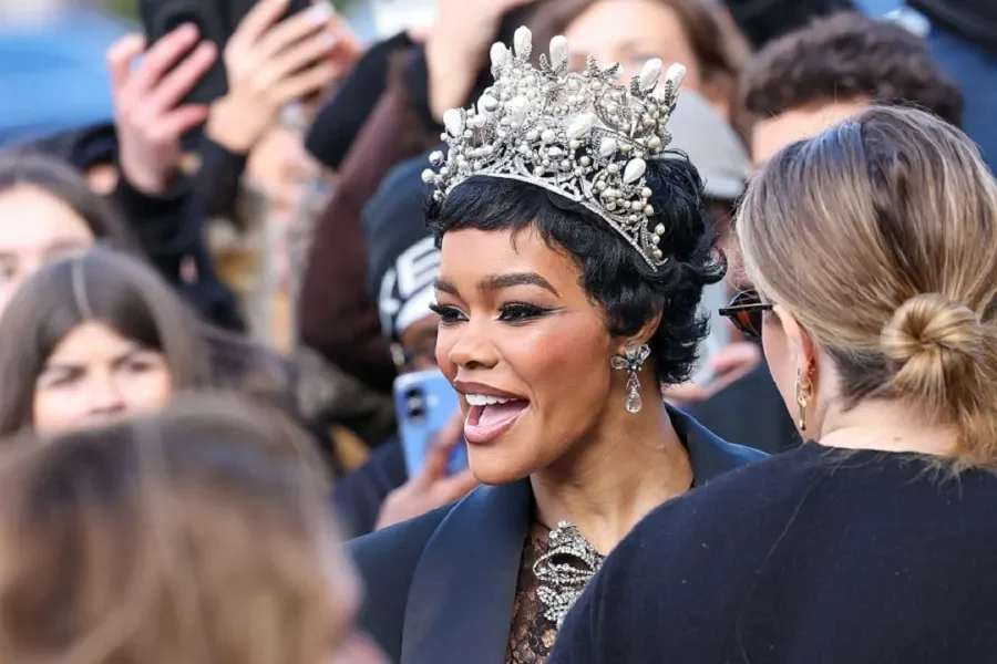 تايانا تايلور وصلت إلى العرض مرتدية بلوزة دانتيل شفافة بكتفين حادّتين مع تنورة ضيقة، وتزيّنت بتاج فضي عتيق مرصع باللؤلؤ والأحجار الكريمة. لفت حول عنقها دبوس الثريا الفضي العتيق المزين بعقدة من الأحجار، ما أضفى عليها حضوراً ملكياً يتسق مع طابع الدار الفنية. تتركز الإطلالة على الجرأة والاناقة معاً في إطار واحد يبرز الهوية الراقية للعلامة.