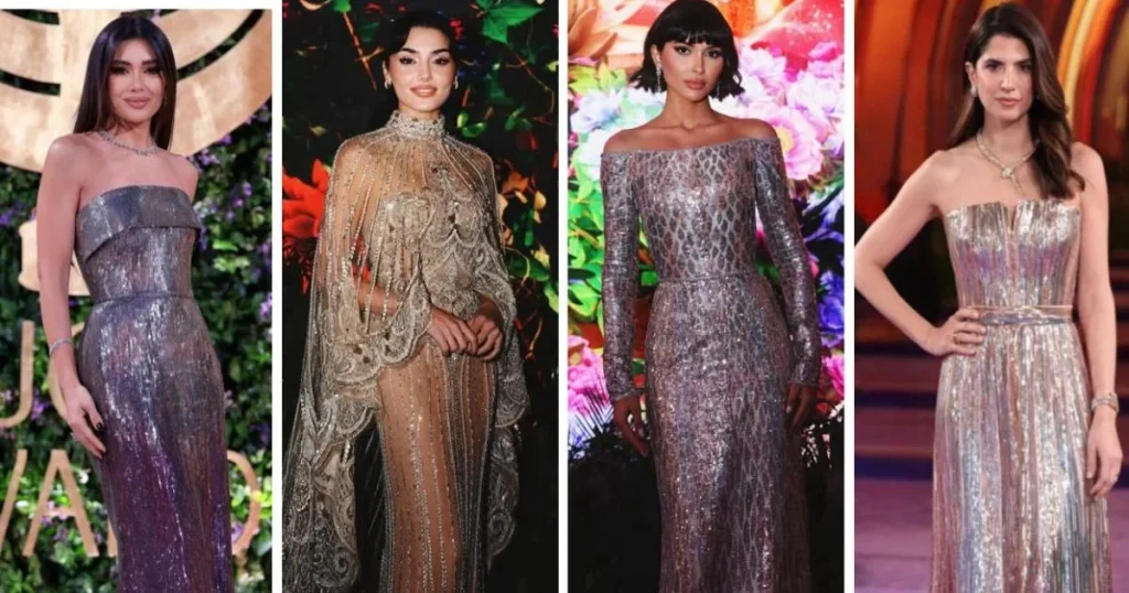 ظهرت عزة سليمان بفستان فضي بقصة أوف-شولدر أنثوية مع أكمام طويلة، يبرز لمعته القوية وتقطيعاته اللافتة ليمنح التصميم طابعًا حديثًا. انسدل الفستان بأسلوب ضيق مع حزام رفيع عند الخصر ليبرز القوام بشكل أنيق. استكمل الإطلالة بالحضور العصري واللمعان المميز لإيلي صعب. أضفى اختيار الحزام والقصّة توازنًا يوازن بين الجرأة والأنوثة الخالصة.
