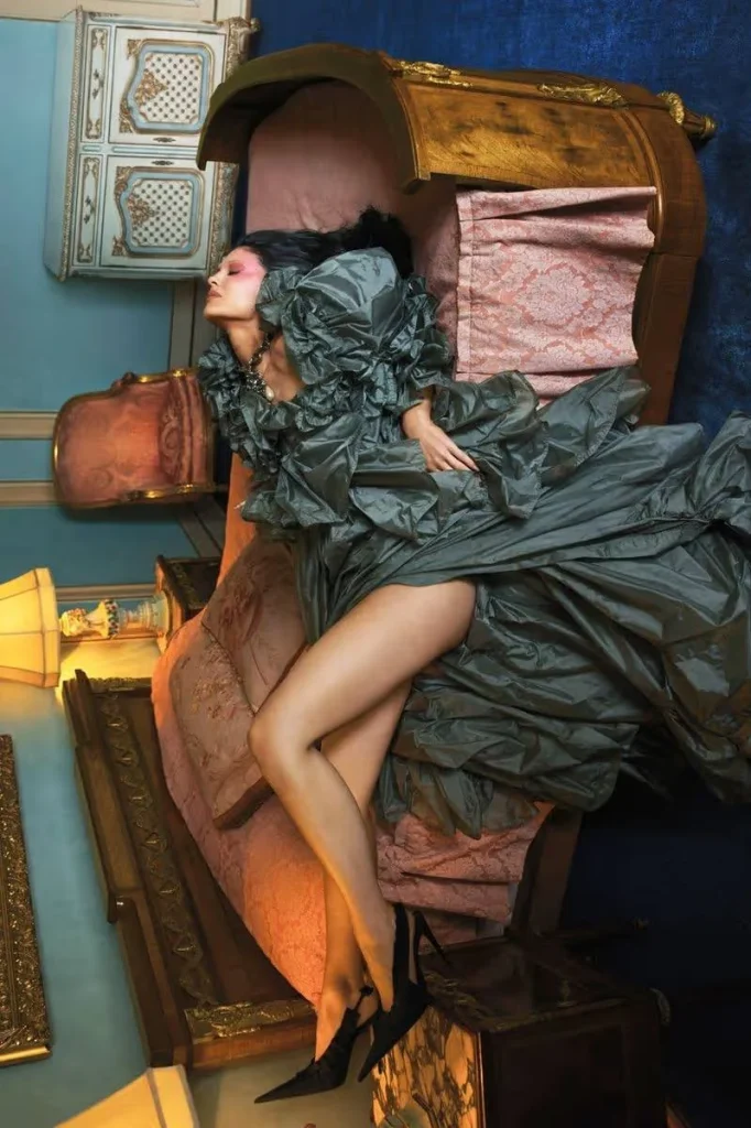 في صورة أخرى ارتدت عباءة وبروش من شانيل، وتؤكد الإطلالة الكلاسيكية على الرقي. وفي لقطة على السرير استعرضت فستانًا وقلادة من سان لوران بتصميم أنتوني فاكاريلو. ثم غيّرت ملابسها إلى فستان من فالنتينو هوت كوتور وأقراط من سابياساتشي، قبل أن تعود مرتدية حمالة صدر من ميوميو وأقراط من بيلبيرون.