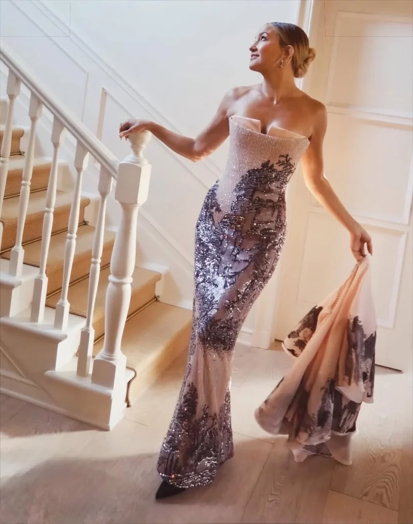 حضرت كيت هدسون حفل توزيع جوائز الأوسكار السنوي الرابع والعشرين الذي أقامته مؤسسة MPTF. ارتدت فستاناً ساحراً من تصميم ميس سوهي لمجموعة ربيع/صيف 2026 للأزياء الراقية. جاء الفستان بلون beige أنيق وزُين برسومات من الترتر الملوّن بتدرّجات مبهرة. صُمّم الفستان ليكون ضيقاً من الأعلى وبقصة V ناعمة من دون أكمام، ويتدلّى بشكل مستقيم مع قصّة رقيقة تعكس أناقتها، ويرافقه كاب بنقشة والألوان نفسها ما أضاف حركة فخمة إلى الإطلالة.